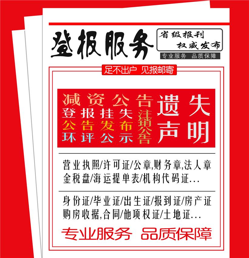 《广西日报》线上办理遗失声明登报、公告登报、版面广告等。报社从业多年,专业的态度,过硬的服务质量!登报电话(400--638--9568)广告刊登种类都有哪些?遗失声明、注销公告、减资公告、清算公告、变更公告、股权转让公告、债权转让公告、拍